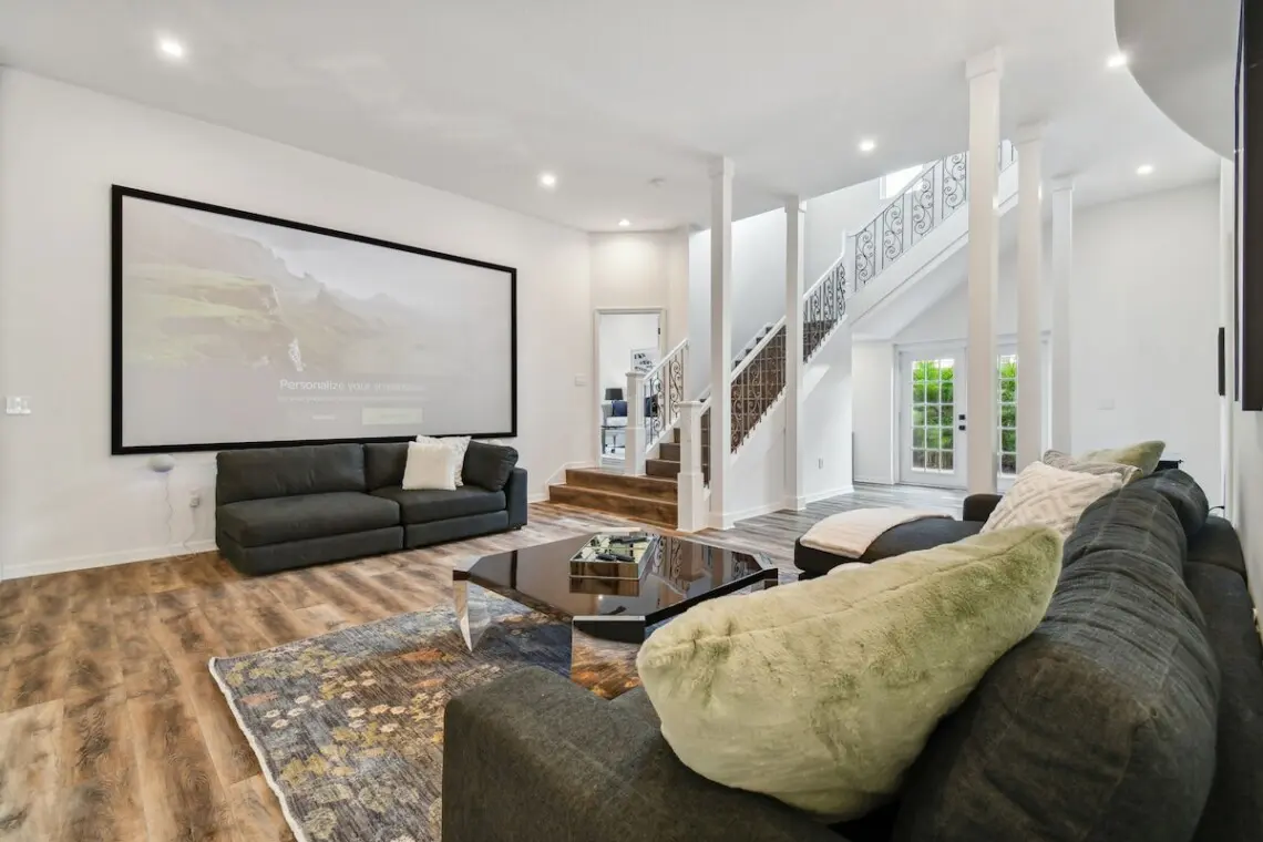 Experience ultimate comfort and entertainment in our living room, featuring a large sectional sofa, a 120″ screen, and a 4k laser projector for fantastic movie nights for the entire family.